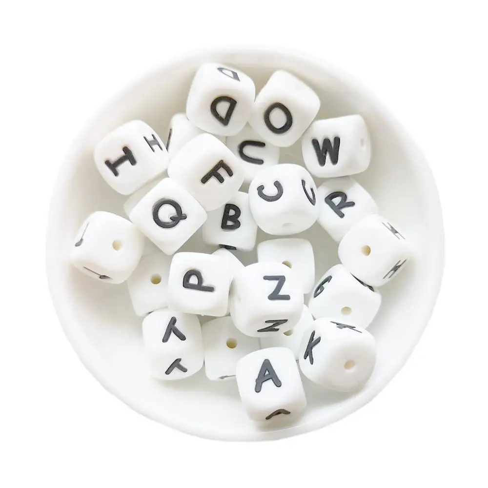 Name: Cuentas de silicona para dentición de bebé, abalorios de letras en inglés de 10mm, sin BPA, cadena de dentición para bebé, juguetes de enfermería, 100/200/500/1000 Uds.